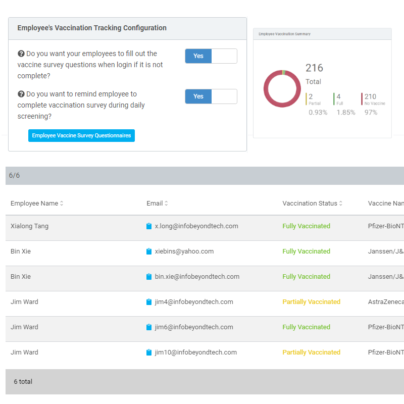Utilizing the vaccine summary graph, management can collect data regarding the percentage of fully, partially, or not vaccinated employees in their workforce. They also can search, sort, and filter specific employee’s vaccination status information to fine tune the back to the office response. Our vaccine tracking piece of the Preworkscreen platform is secure and privacy-protected so employees feel safe disclosing this information to their employer motivating them to return to in-person office work.